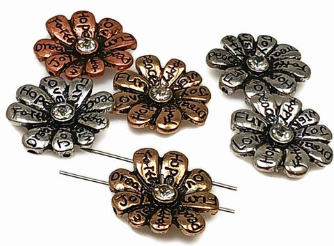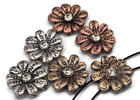 Fill your jewelry with intention and sparkle using these gorgeous inspirational flower 2 hole slider beads. Each dimensional metal flower is engraved with uplifting words on the petals—Love, Hope, Joy, Faith, Peace, Dream—radiating outward from a brilliant clear crystal center. Finished in a mix of antique silver, warm copper, and vintage gold tones, these sliders bring both meaning and style to every design.