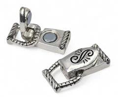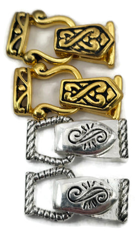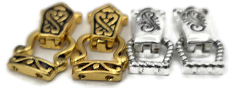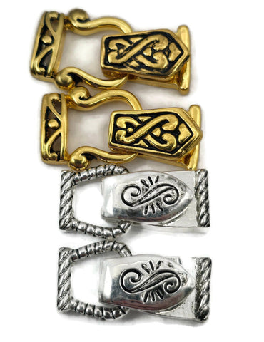 This curated pack includes two matching bright silver clasps with a scroll-top and rope-edge design, and two matching bright gold clasps featuring an intricate Celtic-inspired knotwork pattern. This fold over magnetic clasp assortment is perfect for jewelry making supplies when you want a high-end, boutique-style bracelet closure that offers both warm and cool metal options in one coordinated set.