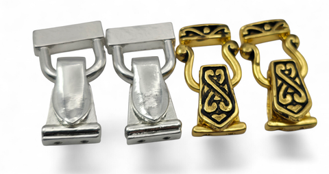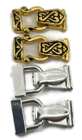 Curated assorted pack of fold-over magnetic clasps for jewelry making. You will receive the exact clasps shown in the photos in a curated magnetic clasp mix featuring two coordinating styles in both cool and warm metal tones. This set includes two bright reflective silver clasps and two bright gold Celtic-style clasps. Each clasp has 2 holes at each end for a secure and aligned connection. Includes 4 clasps (or 8 if you choose the 8-pack).