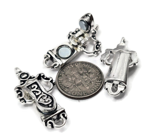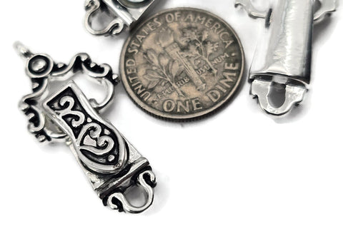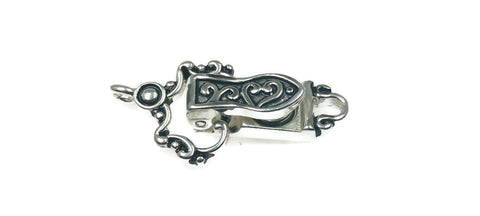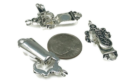 This is a very ornate, bright silver clasp with antique detailing is just gorgeous! This could be used as a single or multiple-strand clasp as it contains loops at each end, as shown. These clasps may be dainty looking, but don't let their size fool you. No longer will your car door steal your jewelry! These work wonderfully on all types of jewelry.