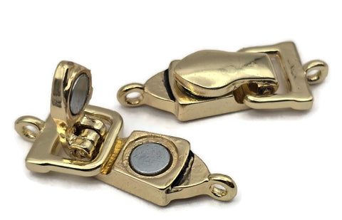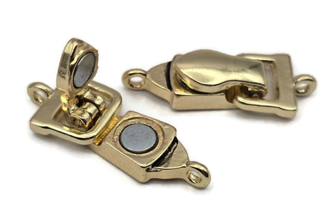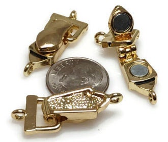 These magnetic clasps are cast in bright gold with a very simple design than some of our other styles. These clasps fold over and have a secure magnetic closure that will hold a lot of pull and weight! Sturdy magnets. Great for the elderly and easy to take on and off. They have 1 loop on each end for stringing as shown in the image.