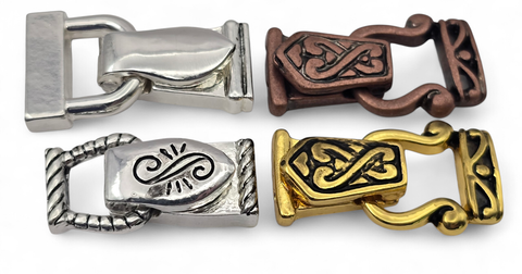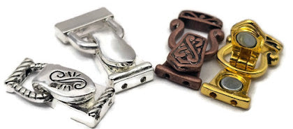 This curated pack features a versatile mix of finishes, including two bright silver clasps (one sleek reflective style and one scroll-top with rope edges), one bright gold Celtic-style clasp, and one antique copper Celtic-style clasp. This fold over magnetic clasp assortment is perfect for jewelry making supplies when you want a variety of metal tones and boutique textures to coordinate with any bracelet closure project.
