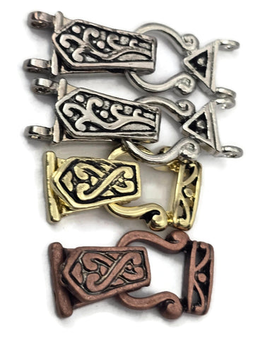 This curated pack mixes cool and warm tones beautifully: platinum silver (two matching 2-loop clasps) paired with bright gold and antique copper Celtic-style clasps. The decorative knotwork/Celtic pattern adds a boutique focal point, making this magnetic clasp mix especially fun when you want your bracelet closure to feel like part of the design—not just the finishing hardware.