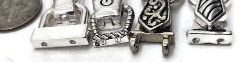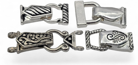 Curated assorted pack of fold-over magnetic clasps for jewelry making. You will receive the exact clasps shown in the photos in a coordinated silver-tone magnetic clasp mix featuring four distinct decorative styles. This lot includes one clasp with 2 loops on each end (in platinum silver) and three clasps with 2 holes on each end (in bright silver). Includes 4 clasps (or 8 if you choose the 8-pack).