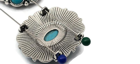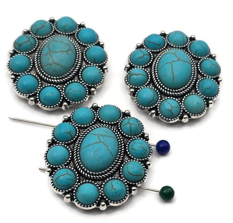 Large Turquoise Concho 2‑Hole Slider Beads, Round Rosette Slide Beads with Faux Turquoise Cabochons, Antique Silver Statement Focals (Set of 3)