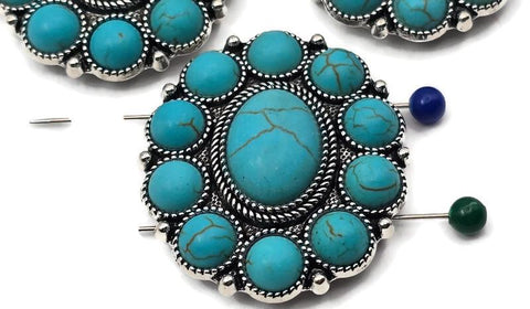 Design bold, structured jewelry with these ornate round two‑hole slider beads. Each statement concho features a domed faux turquoise oval at the center, surrounded by a halo of coordinating cabochons. Detailed rope‑style borders and a bright antique‑silver finish give the settings a vintage rosette look that pairs beautifully with gemstone strands, seed beads, or crystal spacers. If you’re searching for turquoise concho beads, round silver focal beads, or 2 hole slider beads for bracelets and necklaces, this set is made for you.