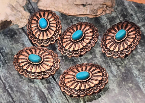 Add warm, vintage character to your designs with these antique copper concho 2‑hole slider beads. Each oval rosette features layered scalloped petals, rope‑style borders, and a sky‑blue faux turquoise cabochon at the center. The copper and turquoise combination delivers classic Southwestern appeal while working beautifully in modern boho stacks and minimal chokers.