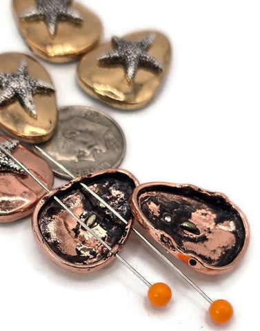 2-hole slider beads size 16 wide and 22.5 mm tall, and the holes are 7.75 mm apart. Cast in light gold and copper with silver starfish on the top. Package as shown in the image.