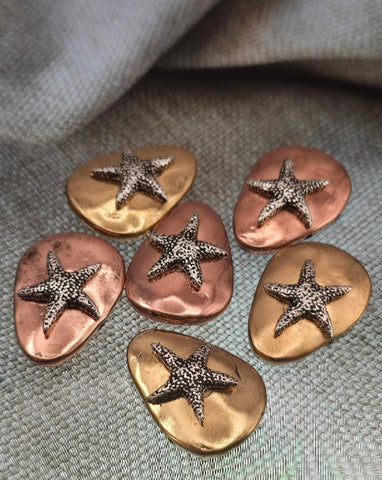 Bring a touch of the seaside to your jewelry creations with these beautiful starfish 2 hole slider beads. Each bead features a detailed starfish design raised against a smooth metallic background, capturing the charm of the ocean. These beads are available in bronze, gold, and copper finishes, making them versatile metal bead findings that work in a wide variety of jewelry styles.
