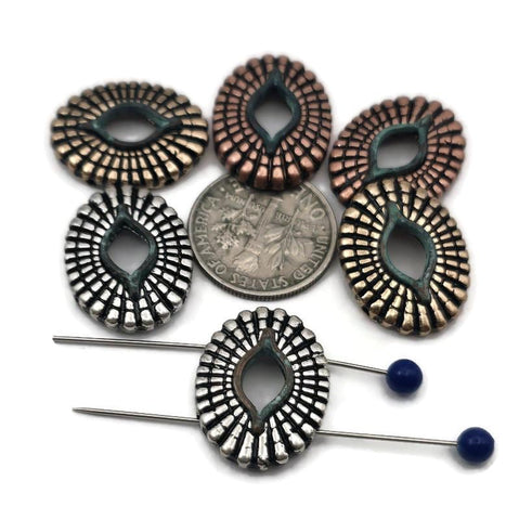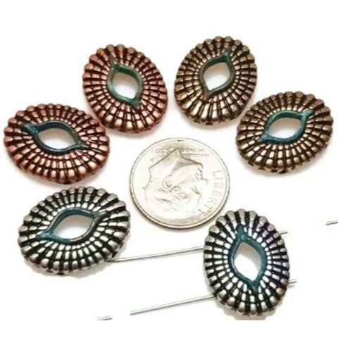 Craft bohemian, Southwestern, and festival jewelry that stands out with these oval textured slider beads in antique silver, copper, and bronze with turquoise patina highlights.