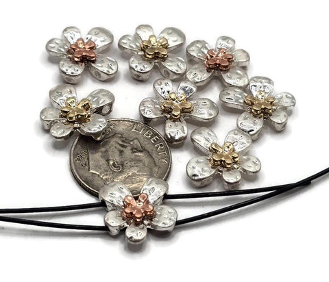Hammered Metal Flower 2 Hole Slider Beads, Copper & Gold Floral Jewelry Findings with Silver Accents