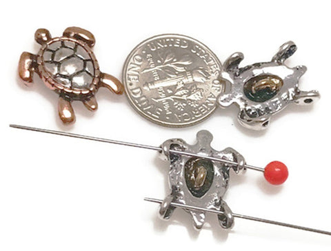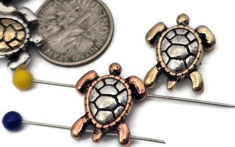 Cast in Bright silver, copper and gold mixed metal lot of turtle beads that are 15 mm wide and 17 mm long with 10 mm between the holes. Great detail.