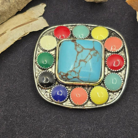 The bead features a raised oval center surrounded by a ring of bright enamel accents in multiple colors. These vibrant colors create a playful and eye catching design while still maintaining a classic western aesthetic. The detailed metal setting adds texture and dimension, giving the bead a rustic artisan appearance that works beautifully in western and boho jewelry designs.