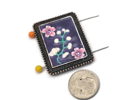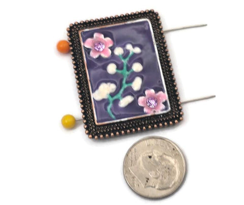 Transform your jewelry designs into wearable art with this unique focal 2-hole slider bead. This large, rectangular statement piece features a deep, regal purple enamel background that serves as a beautiful canvas for a raised, hand-painted style floral design. The entire piece is elegantly encased in a textured antique copper metal frame, providing a warm, vintage, artisan feel that adds instant value and character to your handmade jewelry.