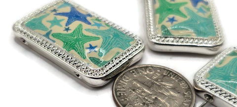 Details: rectangular bright silver 2 hole slider beads with glossy sea‑foam panel and blue/teal starfish motif. Use as focal sliders, spacers, and connector components for bracelets, chokers, necklaces, earrings, bead weaving with duo beads/SuperDuo beads, stringing, and mixed‑media crafting. Lead and nickel compliant. Essential metal beads, beading components, findings, and jewelry making supplies for ocean‑inspired designs.