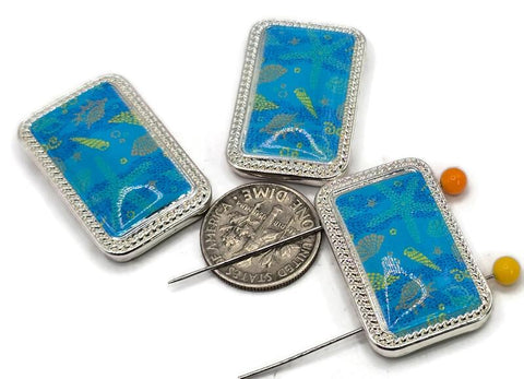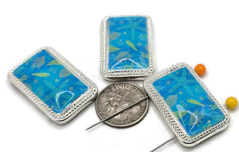 Details: rectangular bright silver 2 hole slider beads with ocean‑blue seashell and starfish motif under a glossy finish. Use as focal sliders, spacers, and connector components for bracelets, chokers, necklaces, earrings, bead weaving, stringing, and crafting. Lead and nickel compliant. Essential metal beads, beading components, findings, and jewelry making supplies for ocean‑inspired designs.