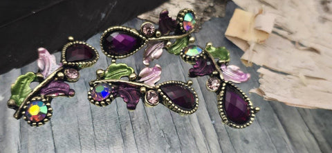 The antique metal finish adds warmth and depth, highlighting dotted bezels, bead accents, and leaf textures. Vivid plum resin pairs perfectly with blush or AB crystals, creating a jewel‑tone mix that photographs beautifully and complements neutrals, metallics, and floral color stories. Whether your aesthetic leans boho luxe, Art Nouveau, fairytale, or cottagecore, these sliders elevate designs with romantic detail and dependable construction.