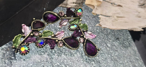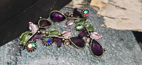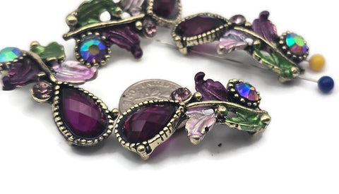 Bring romantic, vintage‑botanical beauty to your jewelry with these purple 2‑hole slider beads. Each ornate focal combines a faceted resin teardrop in a deep plum/berry hue with sparkling Austrian crystals and rhinestones. The stones sit in finely beaded bezels, while antique brass or antique gold metal vines sweep across the piece, dotted with sculpted, hand‑tinted enamel leaves in lavender and garden green. The palette is rich and elegant, delivering heirloom style with luminous color and refined sparkle.