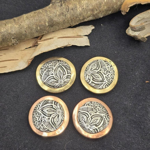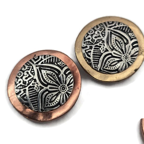 The raised floral pattern features intricate lines and textures that create depth and visual interest. The detailed design gives the bead a vintage artisan appearance while the mixed metal frame adds warmth and contrast. This combination creates a beautiful component that works perfectly in rustic, boho, and western jewelry designs.
