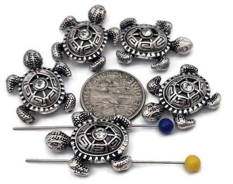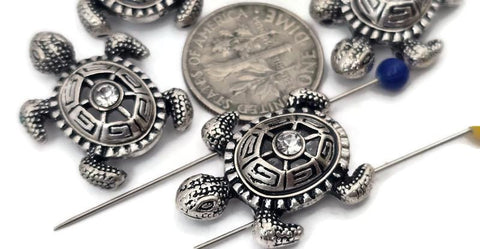 Amazing turtles in silver with antique detailing and shown. 2-hole slider beads with loads of texture and detail with a small cz rhinestone in the center.