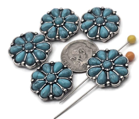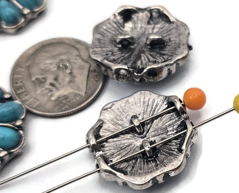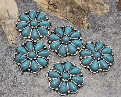 Cast in antique silver metal tones, these floral Conchos with Turquoise centers are perfect for your Western-style jewelry designs.