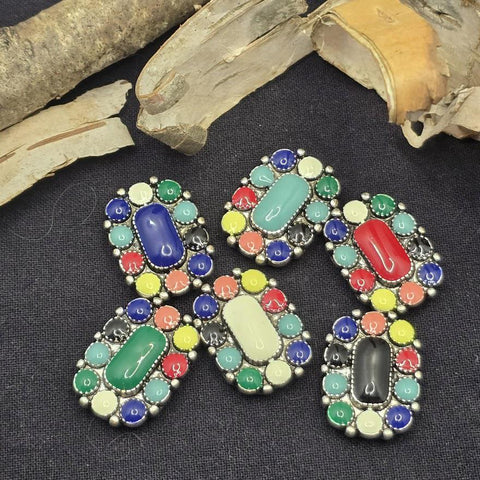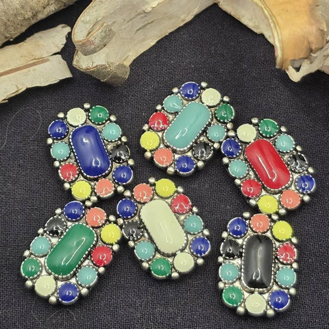 Add bold color and western flair to your handmade jewelry with these beautiful two hole western enamel slider beads. Designed in an oval shape with vibrant enamel accents surrounding a raised center element, these beads create a striking focal point for bracelets and necklaces. Their colorful design and antique style metal setting give them a distinctive southwestern and cowgirl inspired look that stands out in handmade jewelry.
