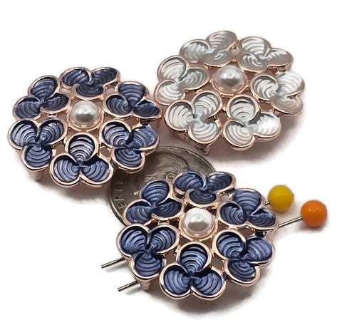 Cast in gold with a faux pearl center and blue and cream enamel petals. These flower or floral beads make perfect focal beads for bracelets, pendants for necklaces, or even earrings and rings. So many jewelry-making possibilities, but also great for hair or purse accessories.