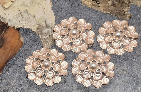 Cast in gold with a faux pearl center and cream enamel petals. These flower or floral beads make perfect focal beads for bracelets, pendants for necklaces, or even earrings and rings. So many jewelry-making possibilities, but also great for hair or purse accessories.