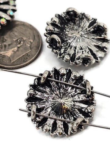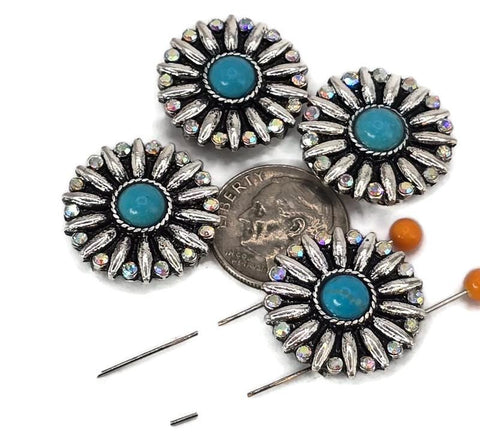 Measuring slightly larger than a US dime, these beads are bold focal accents while remaining practical for wear in various types of jewelry. Their intricate mix of turquoise stone and rhinestones gives them a versatile appeal — they suit everything from bohemian festival jewelry to Southwestern cowboy chic styles, or even modern statement accessories.