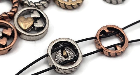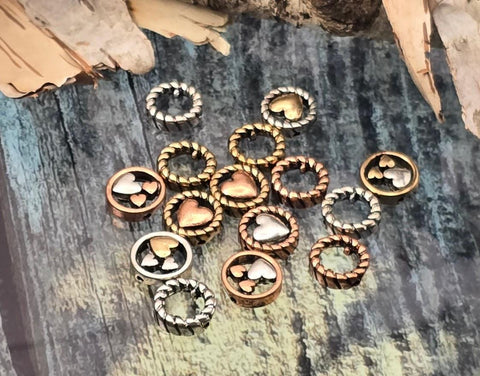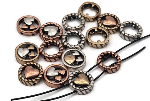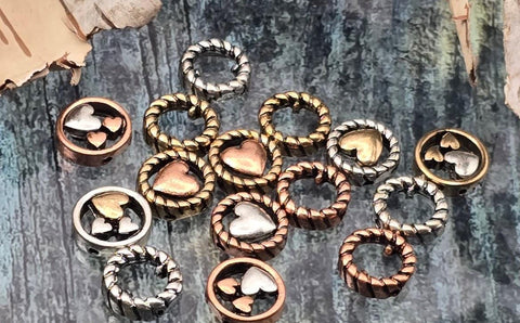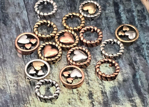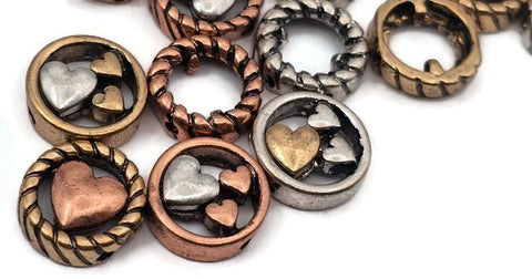 Mixed‑metal heart 2 hole slider beads that instantly become focal beads in artisan jewelry. Each round metal bead features a rope‑edge frame with raised hearts for rich dimension. Unique beads and premium metal findings that photograph beautifully for Etsy and eBay. Lead‑ and nickel‑free with a durable, anti‑tarnish finish. Assorted silver, gold, and copper tones add warm contrast to bracelets, chokers, and pendant designs.