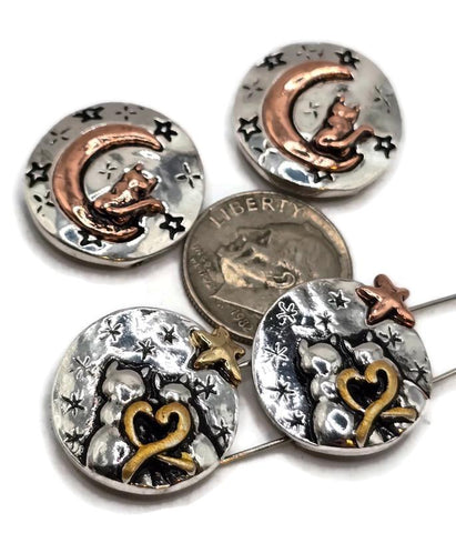 2 Hole Slider Beads (4 pcs) Cat Design for Crafting, Beading or Jewelry Making into Necklaces or Bracelets with Heart and Moons 713-N12