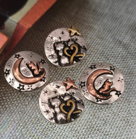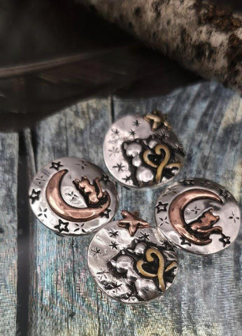 Bring romance and magic into your designs with this charming set of cat and moon 2 hole slider beads. Each round bead captures the beauty of the night sky, featuring two variations of celestial motifs. One showcases two cats sitting together with joined tails in the shape of a heart, surrounded by stars and a golden accent, while the other shows a single cat resting peacefully on a crescent moon with scattered stars. Their symbolic and whimsical style makes them a meaningful choice for animal jewelry, romantic jewelry, and celestial handmade designs.