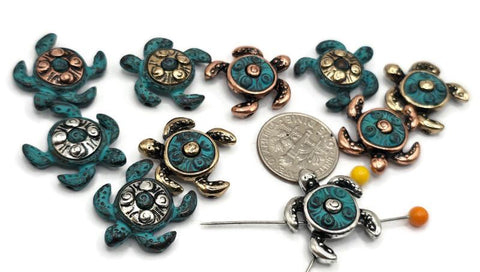 Perfect for Etsy shops, craft fair vendors, or handmade designers looking for distinctive supplies, these sea turtle 2-hole slider beads in antique silver, copper, and gold with turquoise patina will bring a touch of the ocean’s beauty to your creations.