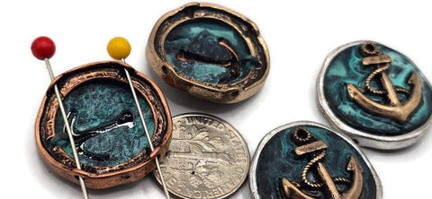 Add these antique copper, silver, and bronze anchor 2-hole slider beads with turquoise patina to your bead collection and create jewelry that reflects the beauty, charm, and spirit of the open sea.