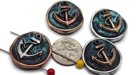 Bring a touch of seaside charm and classic symbolism to your handmade jewelry with these anchor 2-hole slider beads, finished in antique silver, copper, and bronze with turquoise patina accents. Each round bead features a raised anchor design, detailed with a coiled rope motif across the shank, sitting against a richly textured background. With their rustic weathered look and meaningful nautical imagery, these beads are perfect for creating ocean-inspired, bohemian, or maritime jewelry.