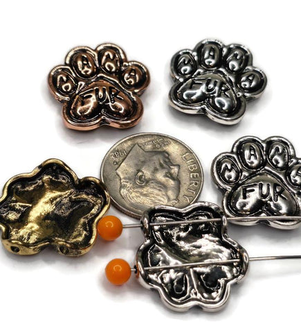 Mixed metal with the words "Fur Mama" engraved on some of them. Each bead is in the shape of a cute paw print and super cute. Antiquing to show the details.