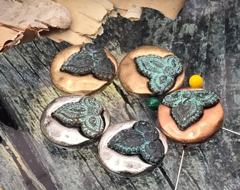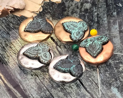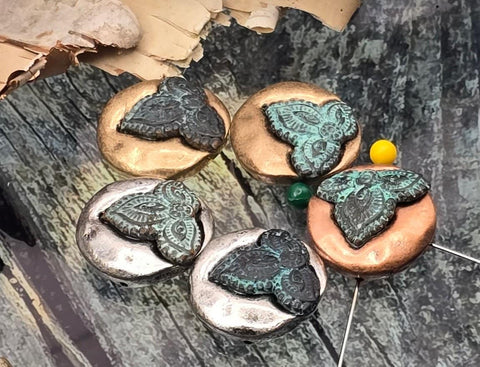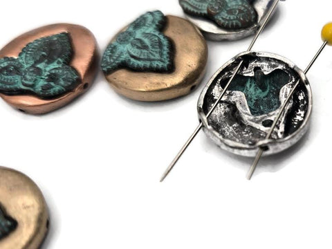 2-hole slider beads size 19 wide and 19 mm tall, and the holes are 11.5 mm apart. Mixed metals of silver, gold, and copper with antique detailing with a floral design on the one edge. Package as shown in the image.