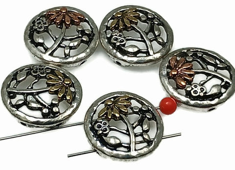 Slider Beads (5 pcs) 2 hole Beads Floral Flower Beads Mixed Metal Round Beads Spacer Beads Silver Filigree Beads Ornate Beads