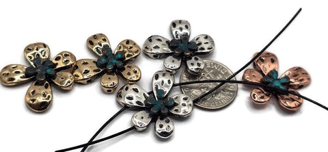 Elevate your jewelry designs with these flower 2-hole slider beads, finished in antique gold, silver, and copper tones with artistic patina accents. Each bead is crafted in the shape of a five-petal flower, featuring detailed petal textures and subtle patina highlighting that brings out the depth of the design. The rustic yet elegant look captures both vintage charm and bohemian style, making these floral beads the perfect focal point for your handmade creations.