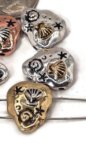 Bring the ocean to your jewelry designs with these unique seashell 2 hole slider beads. Each bead features a raised shell motif surrounded by tiny embossed starfish, swirls, and ocean accents, giving them the perfect seaside charm. Designed with a two-hole slider structure, these beads sit flat in your jewelry, making them excellent choices for bracelet centerpieces, necklace pendants, focal beads, or even spacer beads in multi-strand designs.