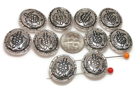 Cast in Bright silver lot of turtle beads that are 18 mm wide and 19 mm long with 10.5 mm between the holes. Great detail.